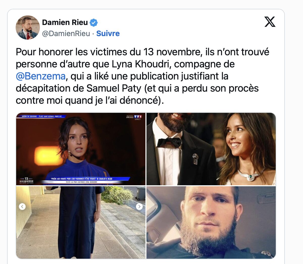 Les bonnes gens qui nous parlent de pardon nous disent qu’elle n’est pas Benzema, qu’il n’y a pas de raison pour qu’elle soit interdite de dire l’hommage aux morts … Elle n’est pas Benzema mais elle l’aime. (du moins on le suppose puisqu’elle est sa compagne). Elle aime quelqu’un capable de cracher sur des morts, voire d’applaudir à la décapitation d’un homme parce qu’il parle de laïcité. C’est qu’elle est coupable, c’est qu’elle pense comme lui. A la limite, en imaginant qu’elle soit follement amoureuse de l’engin Benzema et même qu’elle pense comme lui. alors c’est simple, elle devait refuser de lire. Par décence, par respect des morts, pour condamner sans ambiguïté les horreurs du Bataclan il y a 10 ans.