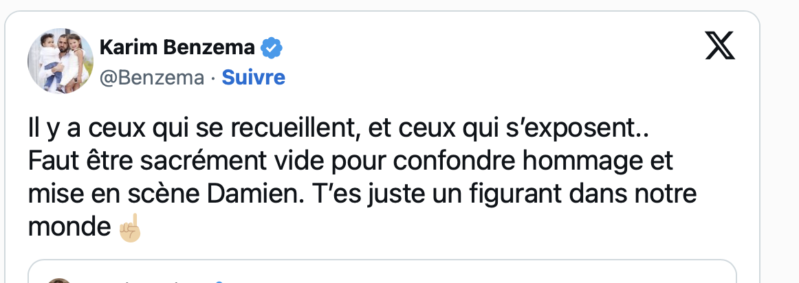 le benzema qui parle de « figurant » , il est bien placé pour dire ca , ca lui arrive de toucher un ballon quand il joue ??? et que se soient les amis des tueurs qui lisent les hommages alors la c est le comble de la sa lo pe rie de nos « responsables » §§§