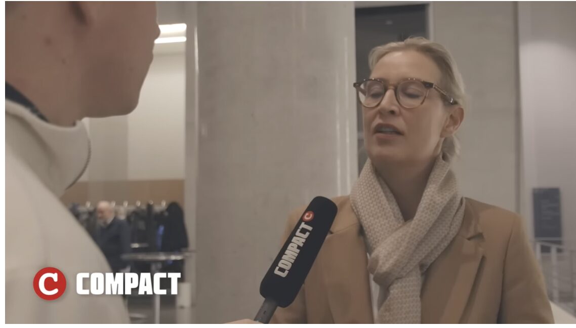 Madame Weidel, cependant, ne semble pas du tout partager l’enthousiasme de ses collègues voyageurs. De manière décevante, lorsqu’on connaît son courage, Weidel, durant cette interview exclusive par COMPACT, me semble plutôt faire du Marine le Pen à vouloir plaire à la presse mainstream qui hurle au loup et à la trahison. Son intelligence, son esprit d’à-propos… font soudain défaut, lorsqu’elle lance que la AfD n’est même pas encore un parti de gouvernement et qu’une telle visite serait dans ce cas inappropriée, tout en bredouillant une histoire sur Viktor Orban qui visite la Maison Blanche. C’en est pénible. On parle d’exclusion … Elle devrait revenir à la raison.