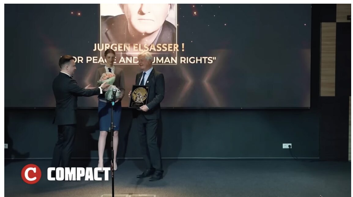 Je n’oublierai pas non plus le couple fondateur de COMPACT, Jürgen et Stephi Elsässer qui viennent d’obtenir une distinction en Bellarus, à Minsk, pour leur œuvre en faveur de la paix. Au début de sa vidéo, l’on peut voir Jürgen en train de commenter son départ de Berlin, dans un aéroport sordide d’un autre temps. En effet, on a l’impression que l’aéroport de Berlin en est resté à l’époque soviétique tant c’est lugubre. Il continue en comparant Minsk avec Berlin qu’il estime en pleine décomposition. À voir pour les germanophones. Pour le plaisir.