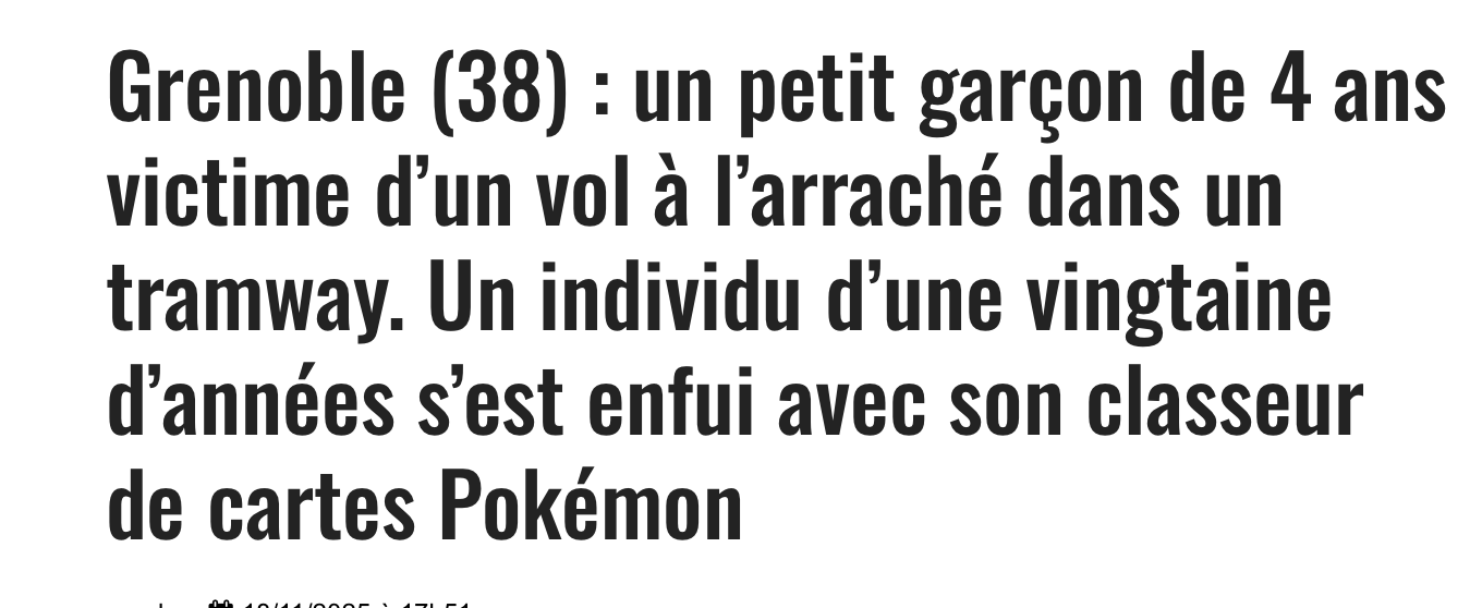 Lundi 17 novembre, un petit garçon de 4 ans a été victime d’un vol à l’arraché dans un tramway de Grenoble, dans l’Isère. Le malfrat a emporté son classeur de cartes Pokémon, pour un préjudice estimé à quelques centaines d’euros.
