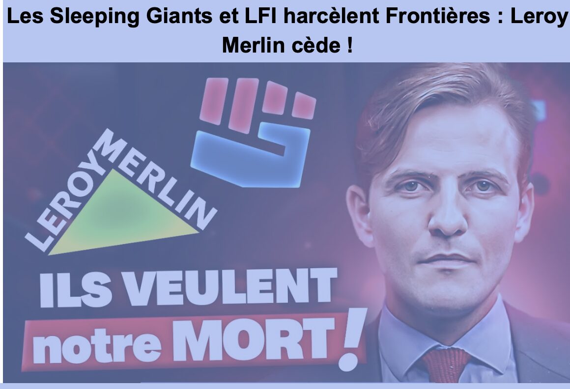 Je prends quelques minutes pour vous écrire directement et vous partager mon état d’esprit face aux innombrables attaques que nous subissons, notamment depuis l’annonce du boycotte du site internet de Frontières par Leroy Merlin, sur la demande de LFI et des Sleeping Giants.