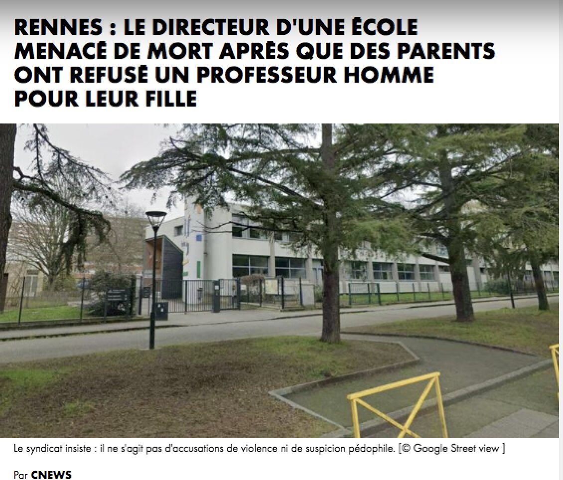 Et voilà qu’à Rennes, des parents de confession musulmane sont allés menacer de mort un instituteur. Mes confrères taisent leur religion, que ce soit mes confrères de la presse écrite privée comme Ouest-France ou « journalistes-fonctionnaires » des télévisions d’État telles France2 ou France3.