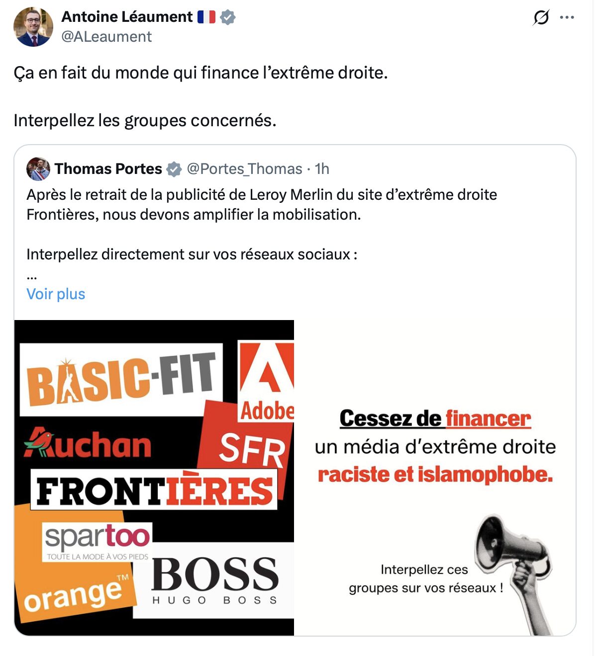 Suite et non fin de la campagne contre Frontières et autres entreprises patriotes à la manière des Sleeping Giants, des méthodes de voyous. Diffamer, menacer... pour faire disparaître la « concurrence libre et non faussée » remplacée par un blanc-seing de politiquement correct ou plutôt par un message politique à destination des musulmans :