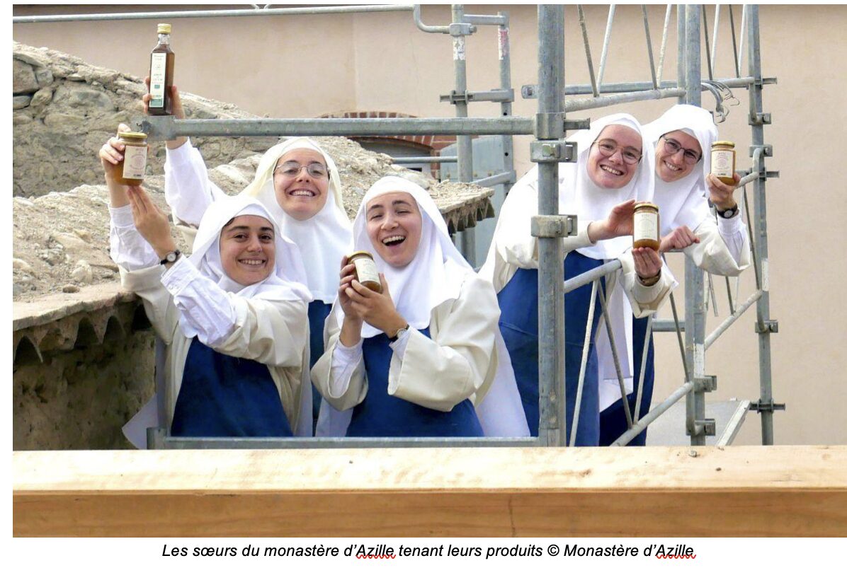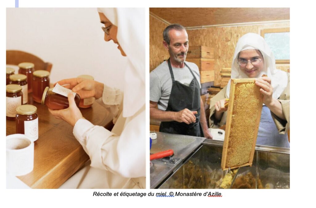 Aujourd’hui, le monastère d’Azille compte vingt Chanoinesses. En plus de leur vie de prière et leur apostolat, les sœurs travaillent de leurs mains : couture des soutanes des chanoines de Lagrasse, productions de sirops bio, et mise en pot de miels locaux.