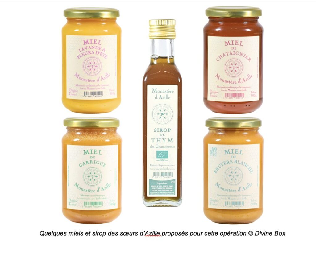 – Cinq miels monastiques différents (formats 125g et 500g) : Lavande, Garrigue, Châtaignier, Bruyère blanche et Bruyère rose. Ces miels sont issus de la production d’apiculteurs locaux, situés à 30km du monastère et mis en pot par les sœurs au sein de leur monastère.