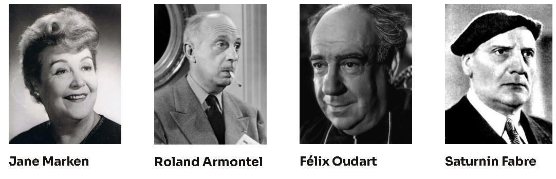 Félix Oudart (Au cinéma, il figure dans plus de cent films entre 1919 et 1953) et Maximilienne (Son rôle le plus connu est celui de la vieille romancière dans L’Assassin habite au 21. Elle a aussi fréquenté la troupe d’acteurs marseillais de Marcel Pagnol : Raimu, Dullac, Charpin, Charblay, Robert Vattier…).