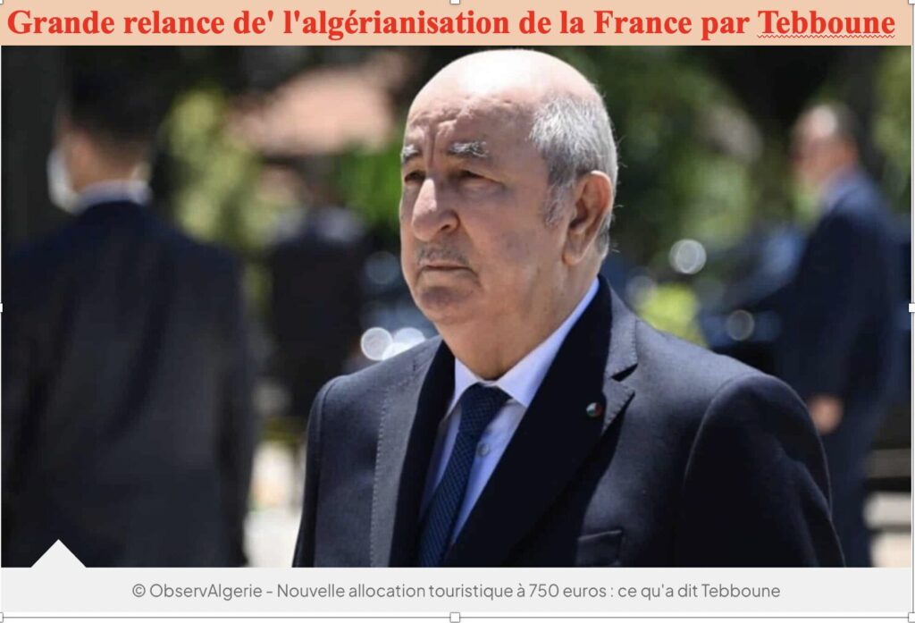 En espérant la fermeture très prochaine de nos frontières et leur surveillance par drones-mitrailleurs + l’araisonnement de toutes embarcations pourvoyeuses de migrants avec retour au point de départ + un moratoire sur la délivrance des visas + fichage biométrique dans nos consulats pour tout demandeur de visa et à ses frais, ci-après l’exposé sur la prime tebboune (bonne lecture!) :
