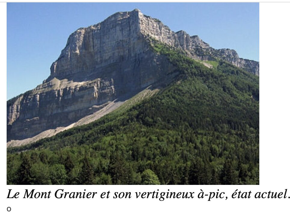 Il s’agit peut-être, là, du plus grand éboulement connu de l’histoire de l’Europe : on estime à environ 5.000 le nombre de ses victimes. Le Granier, sommet des Alpes françaises, est la limite au nord-est du massif de la Chartreuse. Il domine la vallée du Grésivaudan et la combe de Savoie de sa face est, et la cluse de Chambéry avec sa majestueuse face nord. (en 1248). https://fr.wikipedia.org/wiki/Mont_Granier