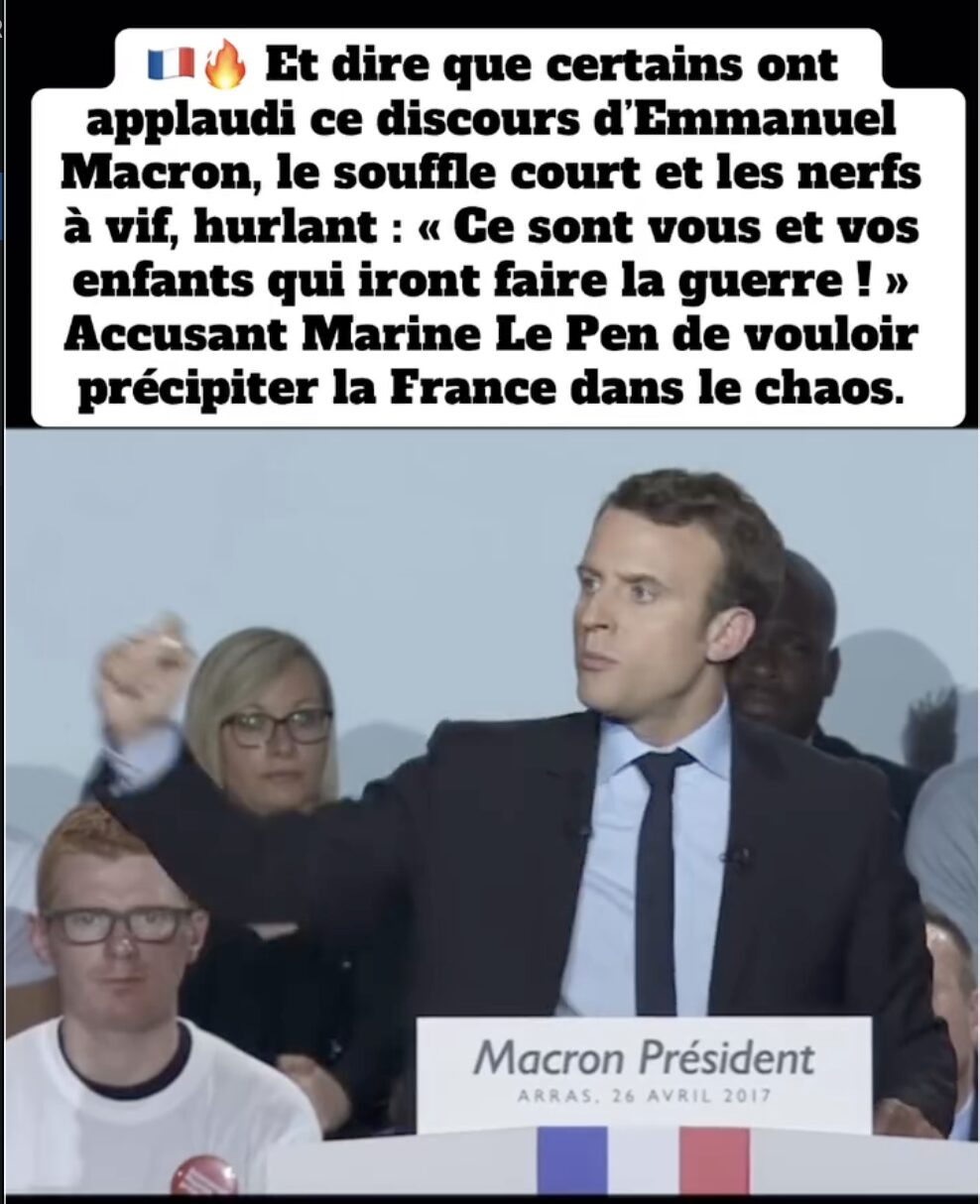 Sauf erreur de ma part, cette sortie du Führer en transe date de la campagne de 2017, lorsqu’il accusait Marine le Pen de vouloir envoyer nos enfants à la guerre !