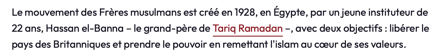 La Société des Frères musulmans a été fondée en 1928 par Hassan el-Banna à Ismaïlia en Égypte, au départ dans le but de débarrasser le pays de la présence des Britanniques en remettant l’islam au cœur de la politique et de la société égyptiennes. D’après l’ONG Counter extremism, elle cherche à « instaurer la charia (la loi islamique) dans un califat mondial ». La confrérie moderne affirme être « non-violente », mais il existe de nombreuses branches dont certaines utilisent la violence, la plus célèbre étant le Hamas ?
