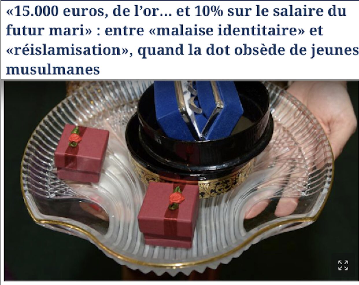 Sous son titre «15.000 euros, de l’or et 10% sur le salaire du futur mari» : entre «malaise identitaire» et «réislamisation», quand la dot obsède de jeunes musulmanes. » Le Figaro précise, sous la plume d’Étienne Jacob : « Cette pratique, qui échappe à toute régulation, fait l’objet de vifs débats en ligne, symbole d’une génération «déculturée», en proie à la «surenchère et la redécouverte islamique».