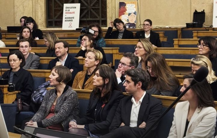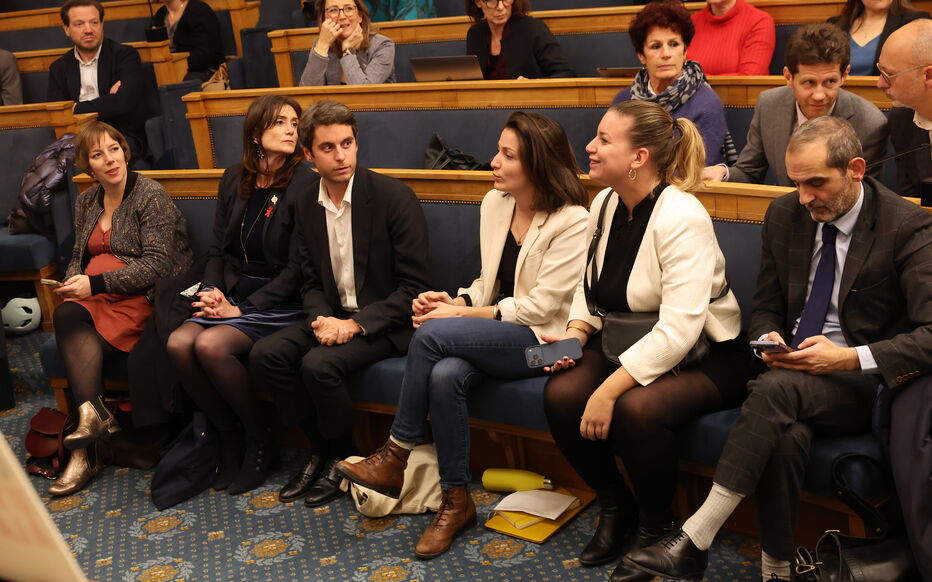 Paris Assemblée Nationale le 2 décembre 2025. Une séance dEVARS (éducation à la vie affective relationnelle et sexuelle) donnée par le Planning familial aux députés. Gabriel Attal et Mathilde Panot Photo Le Parisien / Arnaud Journois