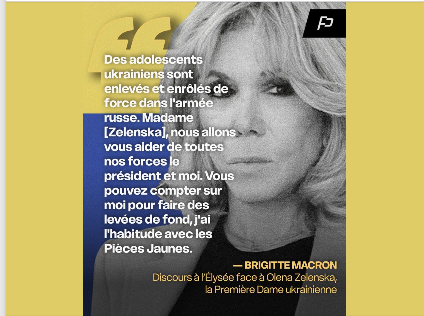 La Macron n’est ni élue ni pourvue de fonction officielle mais elle fait un discours politique devant l’épouse de Zelinsky et sa cour à l’Elysée. Elle accuse Poutine des pires choses, même un cheval de bois lui donnerait un coup de pied ! Heureusement pour nous que Poutine a du sang-froid et est au-dessus de tout ça. Heureusement que les témoignages et images montrant les hommes de Zelensky enlevant et enrôlant de force des jeunes Ukrainiens sont nombreuses…