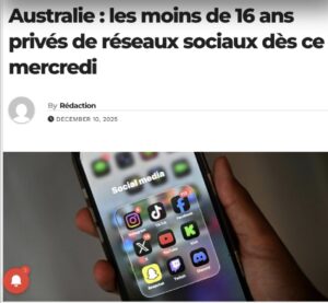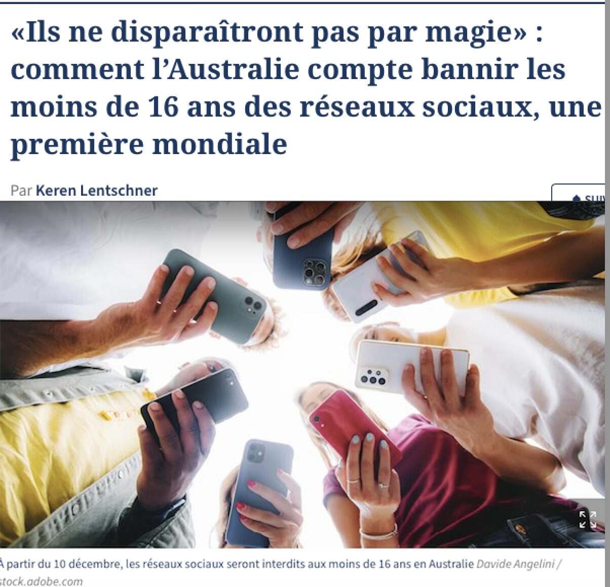 Face à la décrépitude de notre jeunesse à cause des réseaux « sociopathes » laissés entre leurs mains, depuis des années, je me pose la question : de qui se moquent nos dirigeants politiques alors que l’Australie prouve qu’il est possible de contrôler ces réseaux même si les grands réseaux vont tout faire pour saboter cette initiative courageuse et surtout bénéfique pour la vie future de milliards d’actuels gamins !