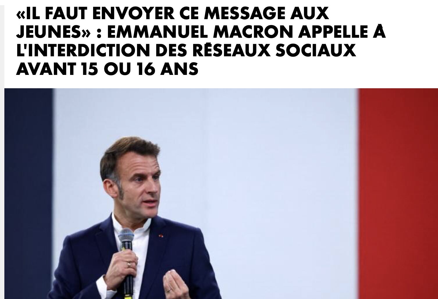 « Le sujet, épineux, sera scruté en France. Pour l’heure, il est impossible d’instaurer une telle interdiction car la législation européenne, qui ne permet pas de créer une majorité numérique (malgré une résolution adoptée en novembre pour fixer à 16 ans l’âge minimal d’accès aux plateformes) l’emporte sur le droit français. Selon une étude de e-Enfance, 67 % des 6-10 ans sont présents sur au moins un réseau social. » -en (1), article du Point-.