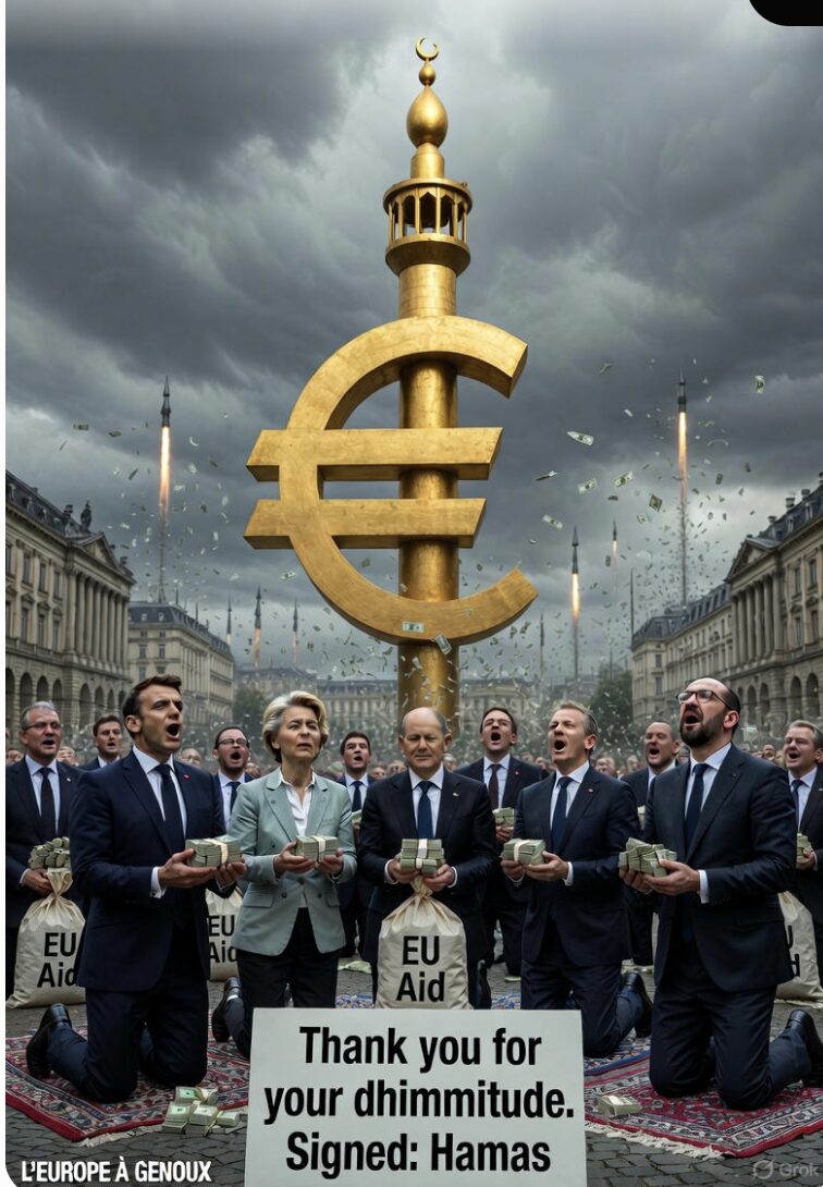 C’est ça, la dhimmitude moderne : l’Europe à genoux, portefeuille ouvert, devant ceux qui égorgent ses alliés et rêvent de la soumettre.