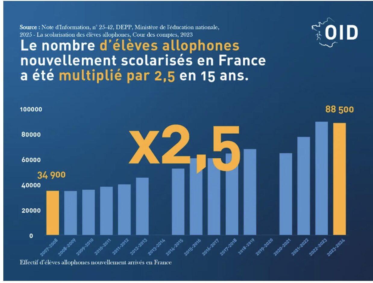 C’est une étude très détaillée que nous livre l’Observatoire de l’immigration et de la démographie (OID), en reprenant un article de Joachim Le Floch-Imad sur l’impact négatif de l’immigration extra-européenne sur notre système éducatif. Des dizaines de milliers d’enfants allophones, faute de maîtriser le français, subissent un déclassement scolaire inexorable qui se répercute sur le niveau scolaire général du pays. Dès lors qu’elle atteint des niveaux excessifs, l’immigration ne s’intègre plus. C’est un sujet gravissime connu mais qui a toujours été mis sous le tapis.