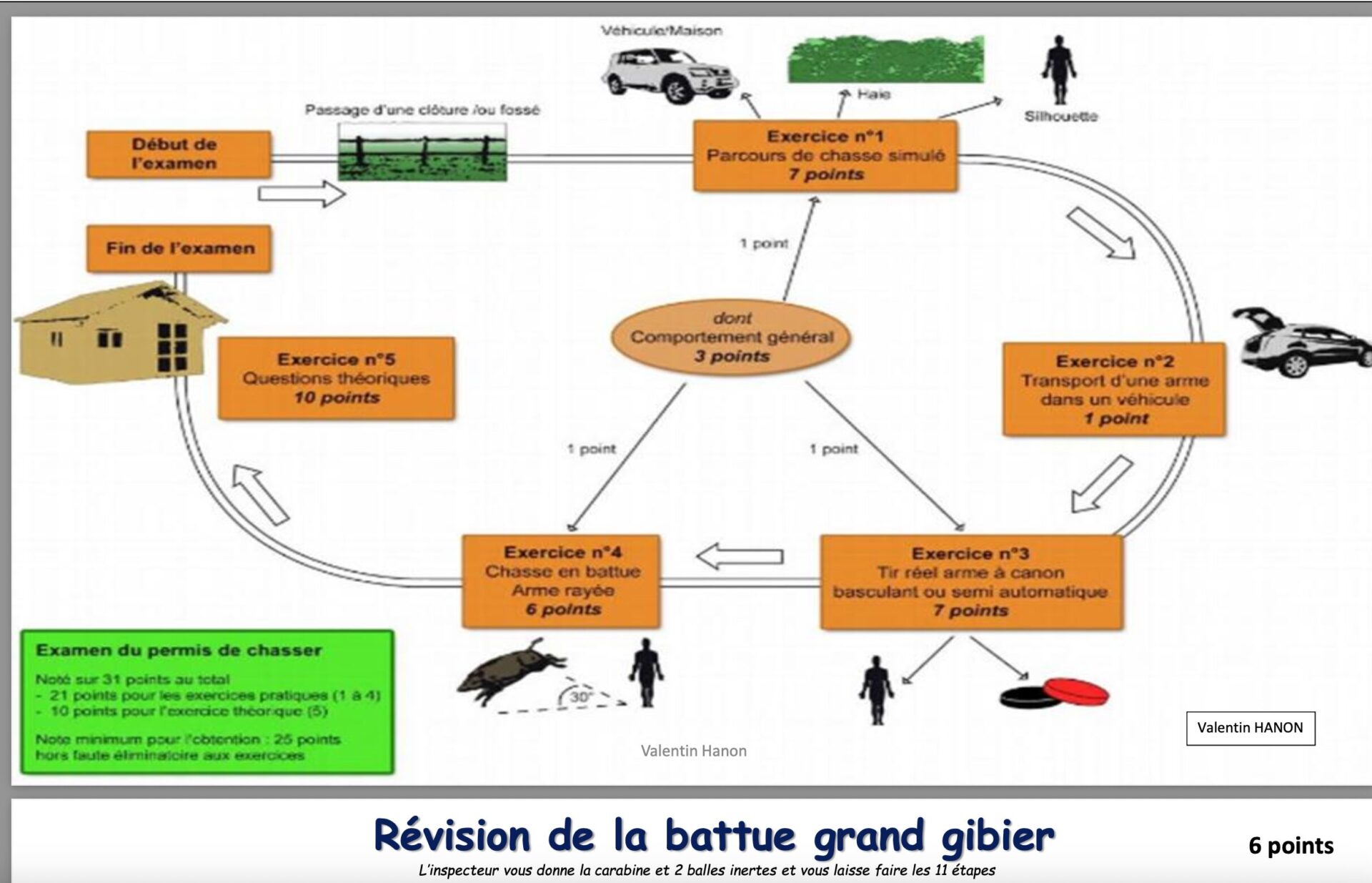L’examen du permis de chasser est sur 31 points : 21 points partie pratique et 10 points partie théorique (10 questions). Pour l’avoir, il faut un minimum de 25/31.