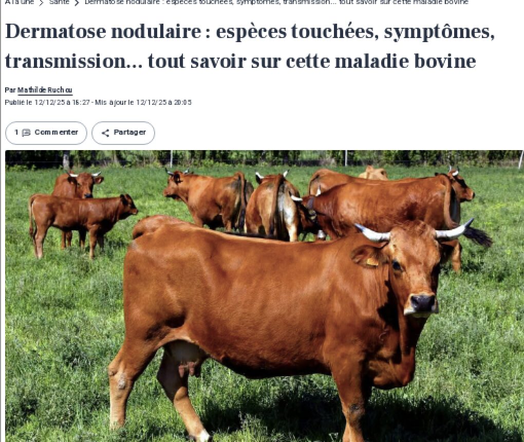 « L’étau s’était dangereusement resserré après plusieurs cas dans l’Ariège. C’est désormais confirmé : le premier cas de dermatose nodulaire contagieuse a été déclaré mercredi 10 décembre dans un élevage des Hautes-Pyrénées. Plus précisément, sur la zone près de Trie-sur-Baïse. « Un cas est confirmé dans une exploitation du département. L’expertise est toujours en cours, des prélèvements ont été effectués sur une bête », signalent les services de l’État dans les Hautes-Pyrénées. Un arrêté préfectoral (…) doit préciser l’évolution des zones réglementaires. À 50 km autour du foyer, notamment, la vaccination devient obligatoire pour les troupeaux de bovins. »