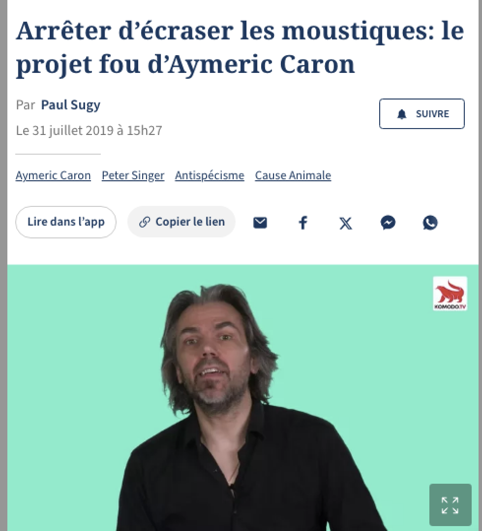 D’ailleurs, je suis étonné que notre cher Aymeric Caron qui a fait campagne pour que personne ne tue un moustique, bestiole hématophage -qui donc se nourrit du sang d’autres animaux dont nous !- ne dise rien en faveur de toutes ces vaches eutha…NAZIées parce que piquées certainement par l’une de ses bébêtes amies !