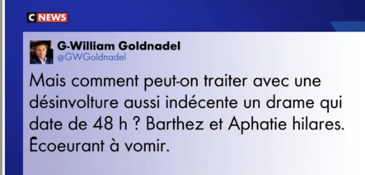 « Mais comment peut-on traiter avec désinvolture aussi indécente un drame qui date de 48 h ? Barthès et Apathie hilares. Écoeurant à vomir. »
