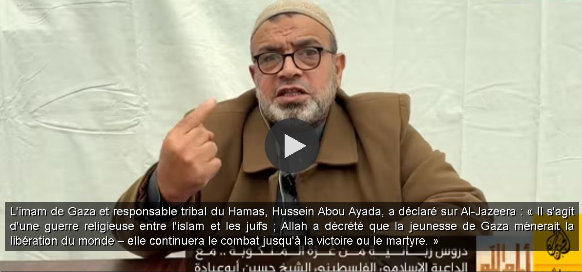►À Gaza, un imam de Gaza, Hussein Abou Ayada (photo ci-dessous) déclare sans détour : « Attachez-moi à un missile et tirez-le sur Tel Aviv ». Le fanatisme de la « Religion de paix » ne se cache même plus, il se proclame avec une franchise glaçante. (Gaza cleric: Strap me to missile and fire at Tel Aviv)