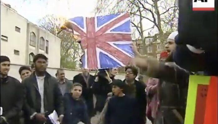 Muslim migrants burning the British flag while shouting “Allahu Akbar.”in the UK.