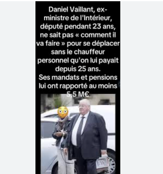 Notre premier sinistre veut réduire notre déficit abyssal. Mais comme il se refuse à supprimer des agences aussi inutiles que nauséabondes comme l’ARCOM pour ne citer qu’elle il a décidé de mettre fin aux avantages des anciens sinistres qui bénéficiaient à vie d’avantages scandaleux et je ne trouve rien de plus normal même si cela fait crier l’ancien sinistre Daniel Vaillant qui se demande comment il va faire, lui qui n’a plus conduit depuis 25 ANS !