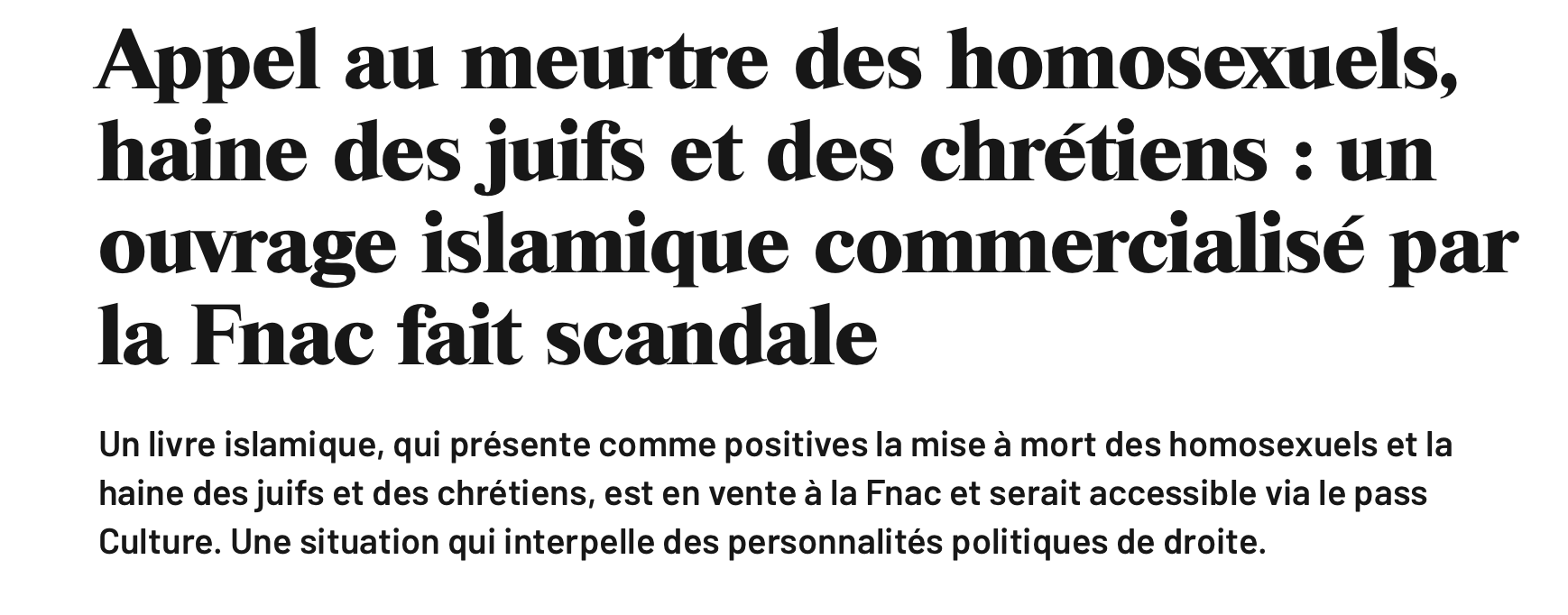 À noter aussi ,car c’est loin d’être anodin , que dans la vidéo publiée par Yohan Pawer , la vendeuse de la fnac ( fnac Saint Lazare à Paris , les lieux sont reconnaissables ) à qui il s’adresse pour lui faire part de son étonnement sur le fait que ce livre islamiste qui appelle au meurtre des homosexuels , des juifs , des chrétiens ,soit présent dans leurs rayons , elle lui rétorque : » et alors ? On vend bien Zemmour » (sic) . J’ai personnellement pu constater à plusieurs reprises que les employés du département livres de cette fnac sont clairement des militants gauchistes affirmés .Les livres très engagés a l’extrême gauche qu’ils choisissent de mettre en évidence sur les présentoirs , le jeu » antifa » en tête de gondole , tout un présentoir rempli d’exemplaires reliés du » saint coran » pendant le ramadan . Sans compter leurs regards mauvais et leurs réflexions acerbes quand on leur demande le dernier livre de Laurent Obertone . À fuir .