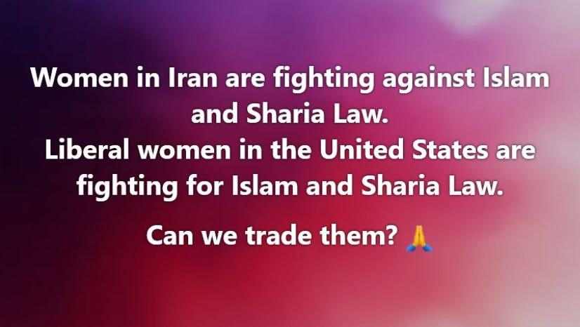 Alors que les femmes en Iran luttent contre l’islam et la charia alors que les femmes américaines libérales luttent pour l’islam et la charia.
