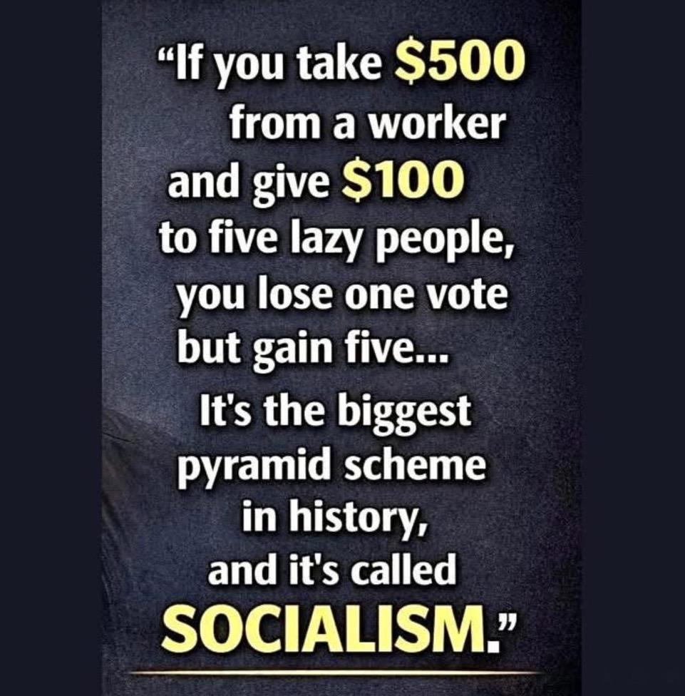 Si vous prenez 500 Dollars à un travailleur et en donnez 100 à cinq paresseux, vous perdez un vote et en gagnez cinq. C’est là le plus grand schéma de pyramide à la Ponzi et cela s’appelle le socialisme!