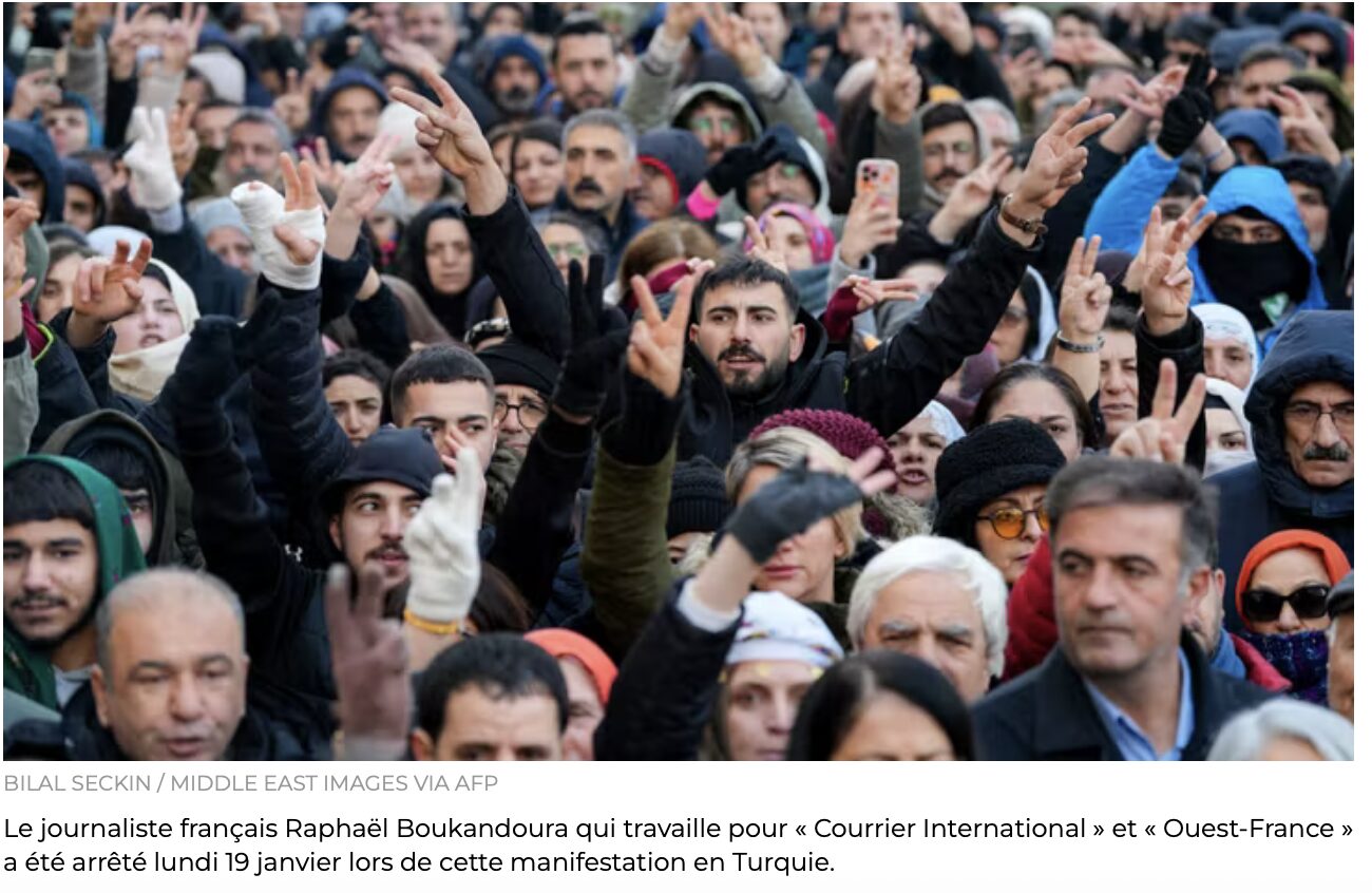 Après Christophe Gleizes condamné à 7 ans de prison en Algérie (mais Macron fait toujours risette à Tebboune et va sûrement insister pour que la France se mette à plat ventre en la personne de Macron devant lui pour les prétendus crimes de la France qui a sorti le territoire de ce qui deviendra l’Algérie de la préhistoire, voilà que la Turquie emprisonne à son tour l’un de nos journalistes, Raphaël Boukandoura. Et Trump invite le monstre turc à participer aux négociations sur Gaza !!!! On marche sur la tête !!!
