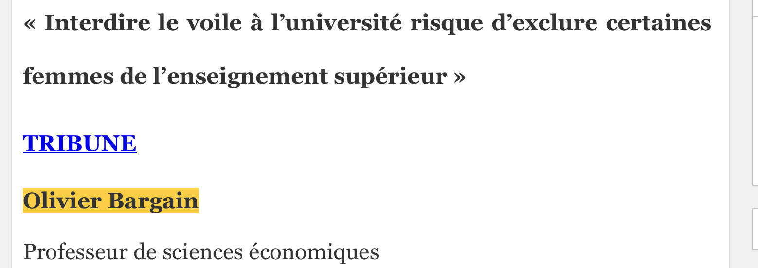 Alors, les discours d’un Bargain qui sentent le moisi... Pff ! Il en est resté au voile « c’est mon choix » à l’heure où les femmes meurent en Iran parce qu’elles refusent de le porter.. Il en est resté au risque d’exclusion des études. Mais, pépère, si les filles sont motivées pour faire des études elles s’en donnent les moyens ou bien elles choisissent de rester enfermées chez elles à l’abri des regards. Point barre
