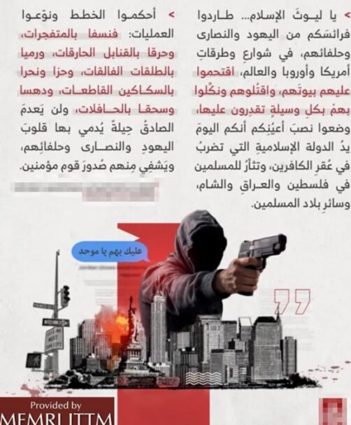 Le 11 janvier 2024, un média pro-État islamique (EI) a diffusé deux affiches incitant à des attentats à New York. Ces affiches s’inscrivaient dans le cadre d’une campagne d’attaques mondiale intitulée « Tuez-les où que vous les trouviez », annoncée le 4 janvier par le porte-parole de l’EI. Dans un message audio mis en l.igne, ce dernier a déclaré son soutien aux musulmans de Gaza et a exhorté les membres et sympathisants de l’EI à perpétrer des attentats dans le monde entier, y compris des attaques de loups solitaires, en Occident.