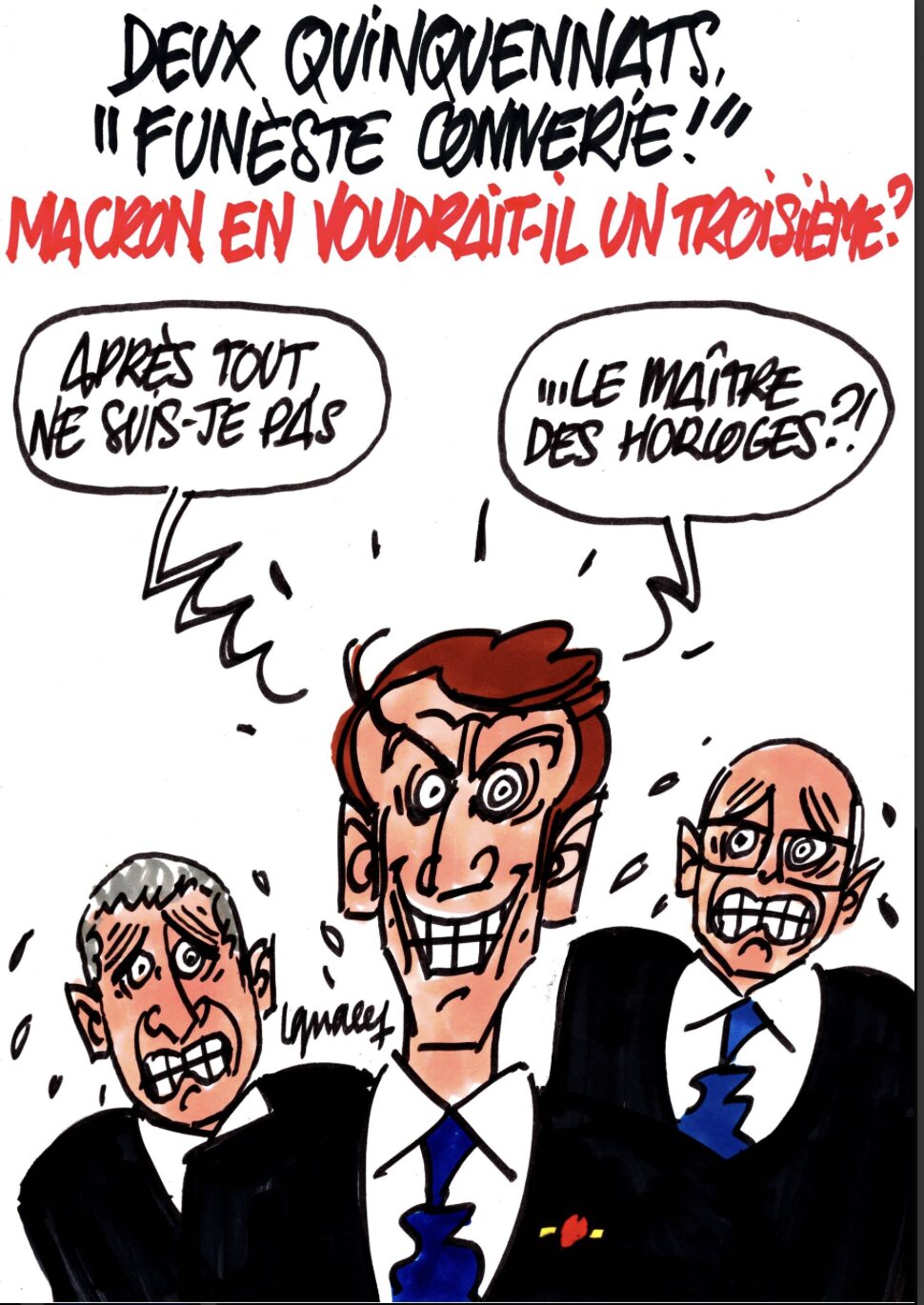 Dans un tel cas, le comédien en poste actuellement à l’Élysée, comédien qui aura du mal à se voir, en juin 2027, exclu de la scène mondiale…-dont les milliards de téléspectateurs ont tant apprécié sa… paire de lunettes !- pourrait trouver l’excuse de renouveler son squatte élyséen, voire -naturellement- que quelqu’un d’autre que lui monte une cavale contre lui, et « le pousse » à démissionner quelques mois avant la fin de « son » actuel second quinquennat !