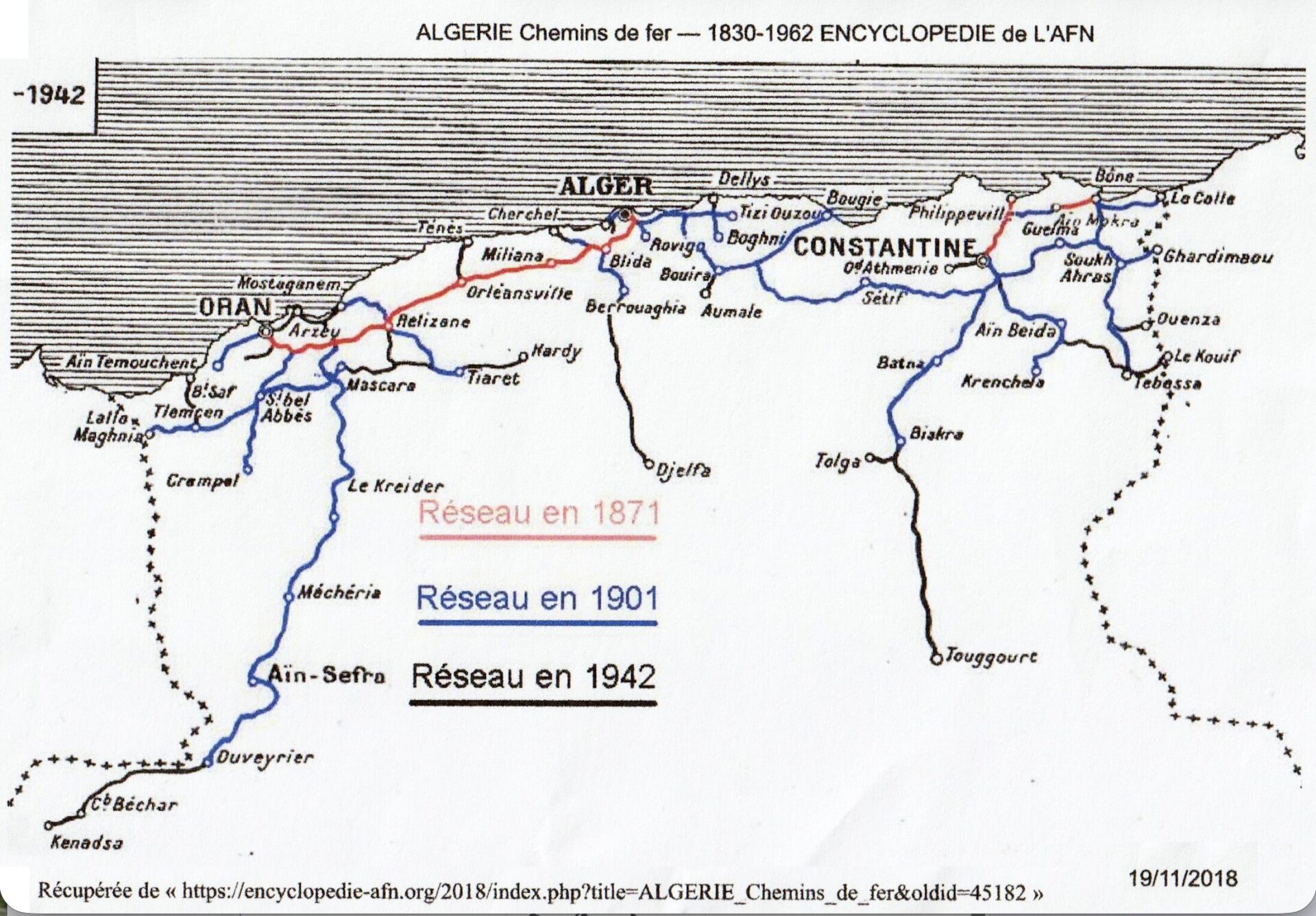 - Chemins de fer : Réseau côtier et intérieur développé dès 1857-1870 (Alger-Oran-Constantine, lignes vers le Sud). La carte historique montre un réseau très ramifié dès 1930, encore utilisé aujourd’hui (SNTF).