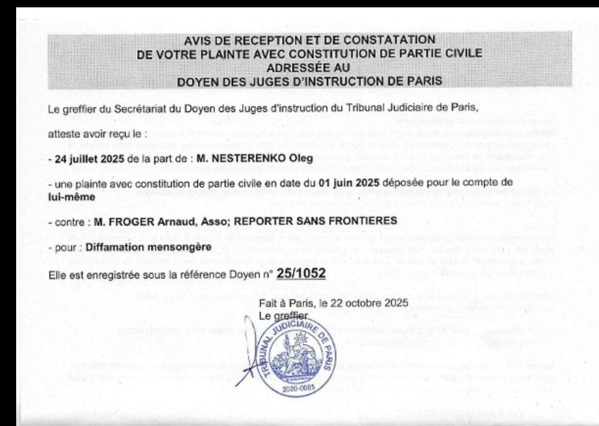 Fort de preuves matérielles et vérifiables, réfutant point par point les allégations fallacieuses proférées par Reporters Sans Frontières, une plainte assortie d’une constitution de partie civile a été déposée auprès du juge d’instruction du Tribunal Judiciaire de Paris.