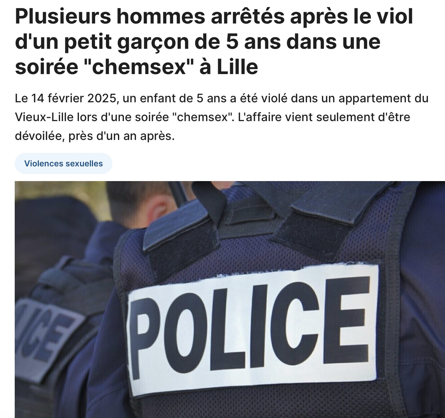 « Dix hommes ont été mis en examen après qu’un enfant de 5 ans a subi des viols avec torture ou actes de barbarie lors d’une soirée chemsex organisée à Lille en février 2025. Certains ont participé activement, d’autres ont reçu des vidéos sans alerter les autorités. Le père, à la fois mis en examen et victime, nous livre le récit de cette nuit d’horreur. »