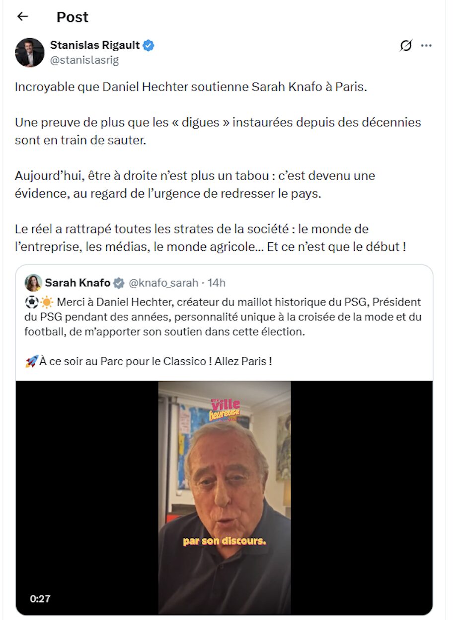 Clin d’oeil : l’ancien Président du PSG Daniel Hechter soutient Sarah Knafo ! 9 février 2026 Monique B Les Résistants 0 3 total views, 3 views todayDaniel HechtermunicipalesParisPSGSarah Knafo