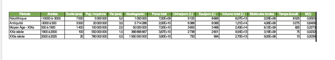 Je ne vous livrerai que les deux conclusions principales : le nombre de molécules d’eau issues d’urine de porc relâchées dans l’hydrosphère depuis le Néolithique est de 6,41 x 10^39 et la dilution est de 1,38 x 10^-7.