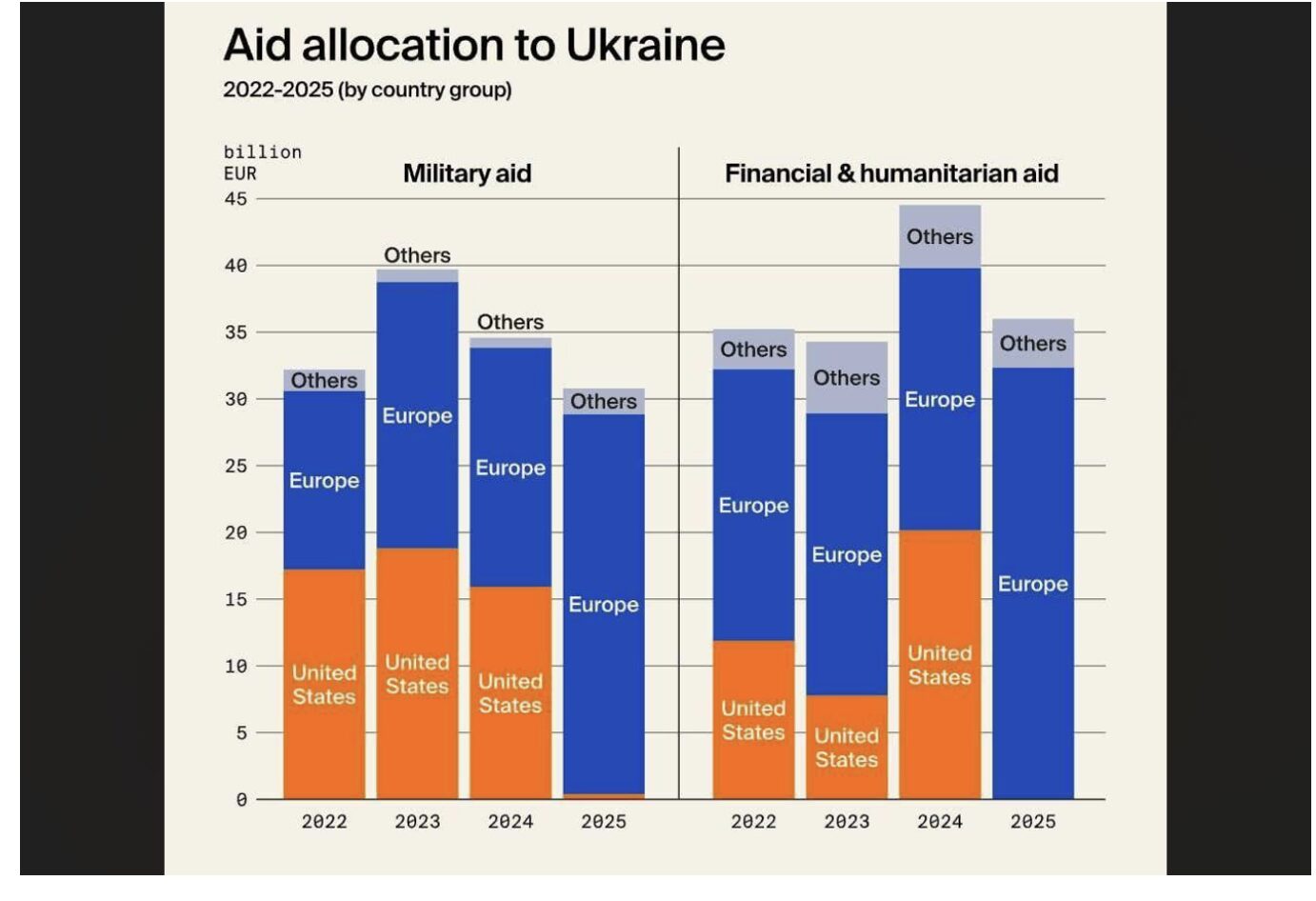 « L’aide militaire des États-Unis à l’Ukraine en 2025 a diminué de 99 % par rapport à la période précédente, tandis que le volume de soutien des pays de l’UE a augmenté de 67 %, selon le rapport de l’Ukraine Support Tracker. » (blog Telegram de Boris Karpov)