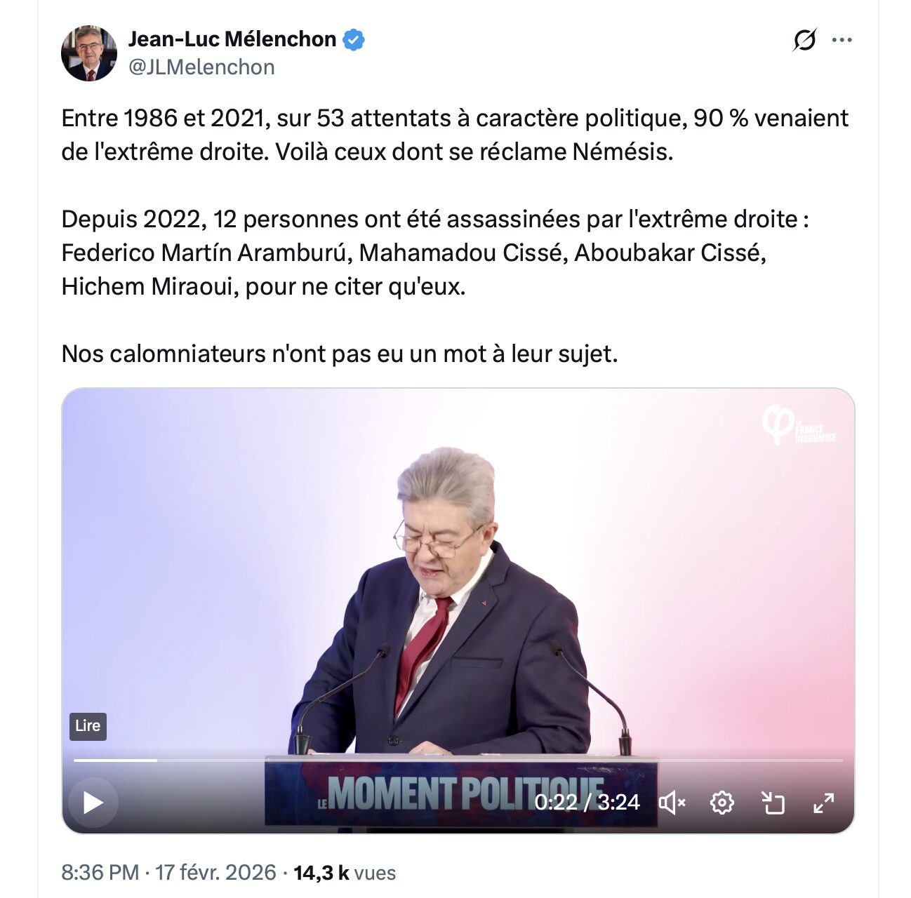 — Jean-Luc Mélenchon (@JLMelenchon) February 17, 2026