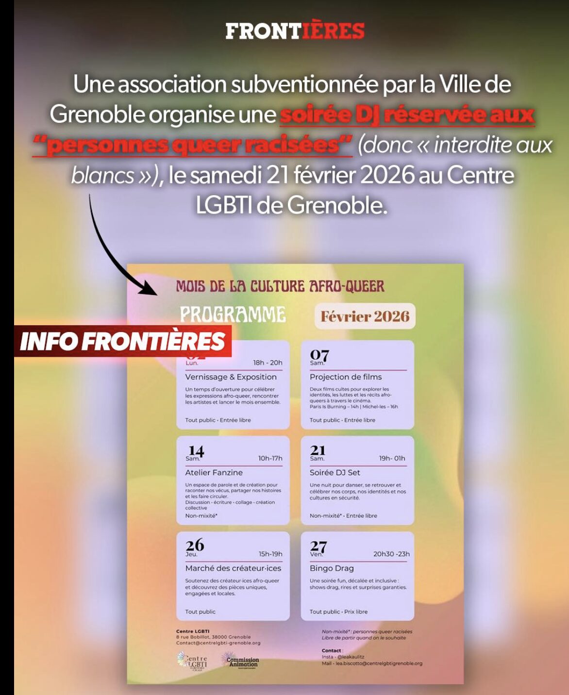 À Grenoble (Isère), Valentin Gabriac, le candidat Rassemblement national (RN) dans le cadre des élections municipales de mars prochain, dénonce en exclusivité sur Frontièresl’organisation d’une soirée DJ réservée aux « personnes queer racisées » le samedi 21 février prochain au Centre LGBTI de la ville.