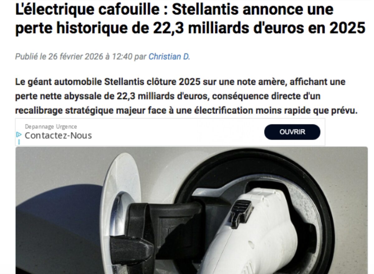 « Frappé par un coup de frein sur l’électrique, Stellantis affiche une perte colossale de 22,3 milliards d’euros en 2025 » !