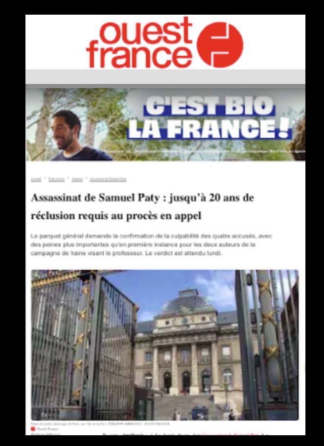 Si j’ai remarqué le titre « C’est BIO la France » voisinant à la une d’Ouest-France avec celui sur le procès de ceux qui ont poussé à l’assassinat de Samuel Paty, c’est parce que j’espère bien que les incitateurs de cet assassinat, vont voir leurs peines aggravées par rapport au premier verdict ! Et ce sera tant mieux ! Et ainsi, je pourrai crier… « C’est BEAU la France ! » si le verdict rendu lundi est…