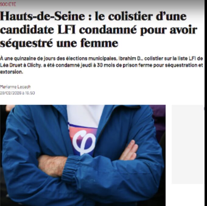 « Hauts-de-Seine : le colistier d’une candidate LFI condamné pour avoir séquestré une femme » et ajouté : « À une quinzaine de jours des élections municipales, Ibrahim D., colistier sur la liste LFI de Léa Druet à Clichy, a été condamné jeudi à 30 mois de prison ferme pour séquestration et extorsion. »