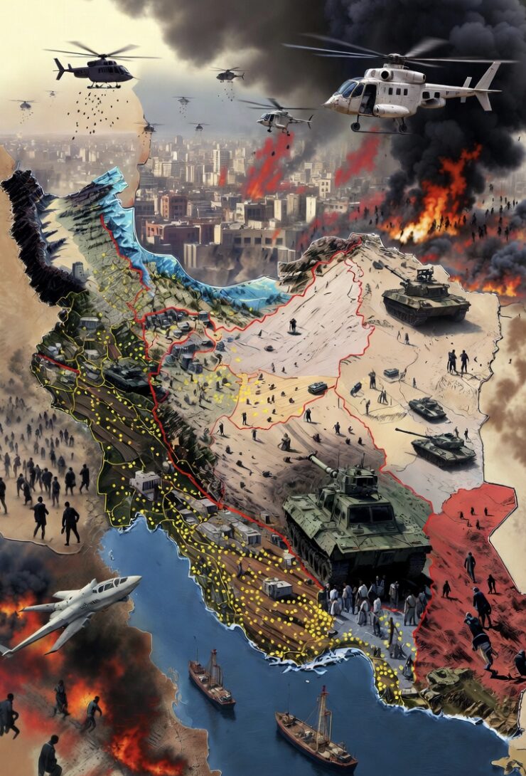 3. Effondrement + chaos interne → combinaison de bombardements continus + protestations massives + soulèvements ethniques (Kurdes au nord-ouest, Arabes sunnites au Khouzistan, Baloutches au sud-est).