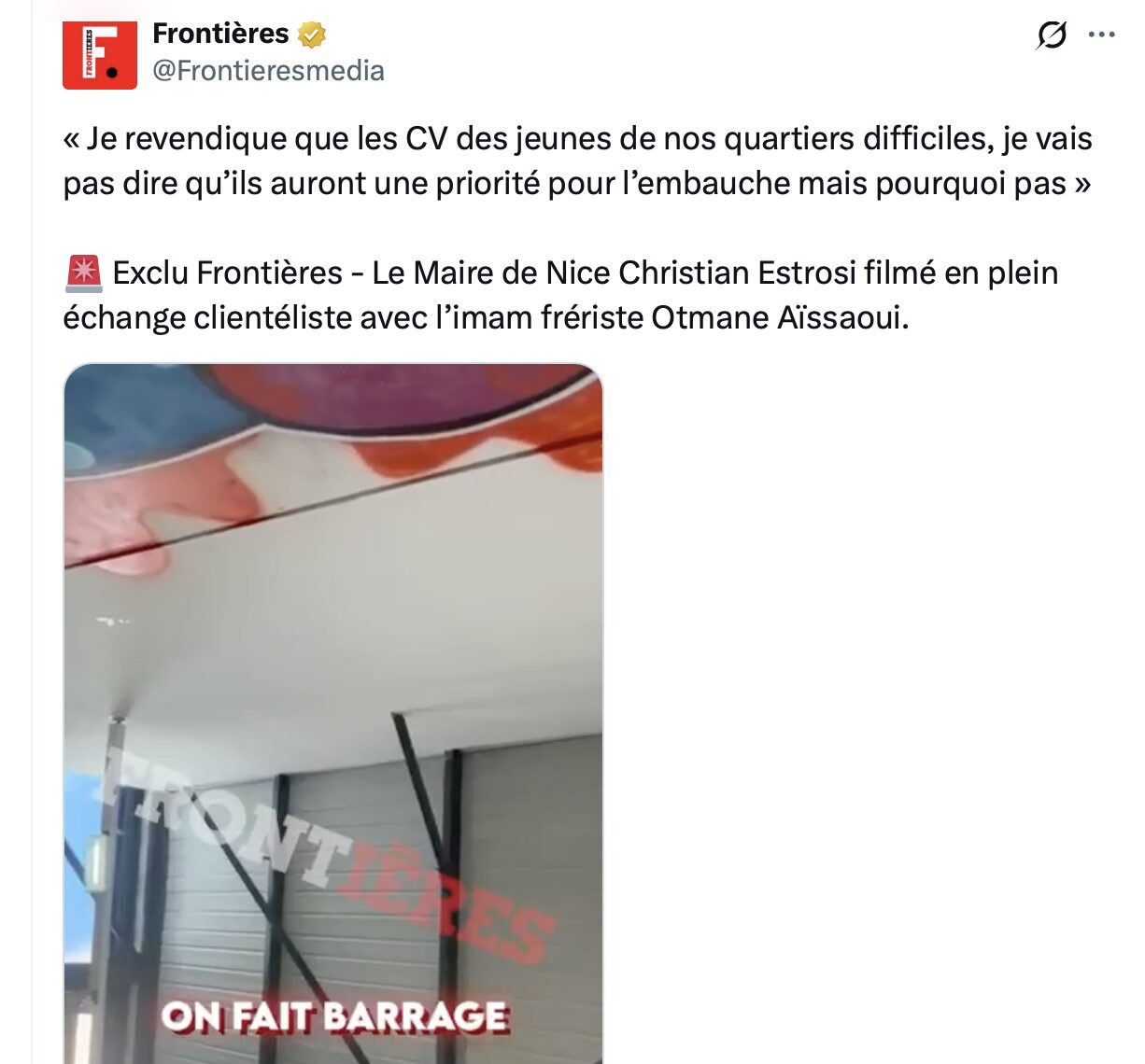 On est loin du discours républicain universaliste qu’Estrosi aime brandir par ailleurs. Ici, pas de mérite individuel, pas d’égalité devant l’emploi public ou privé : une demande explicite d’avantages ciblés pour une catégorie communautaire, présentée comme un gage de « stabilité » . Et le maire, loin de rappeler les principes de la laïcité et de l’égalité, semble négocier, conforter, promettre….