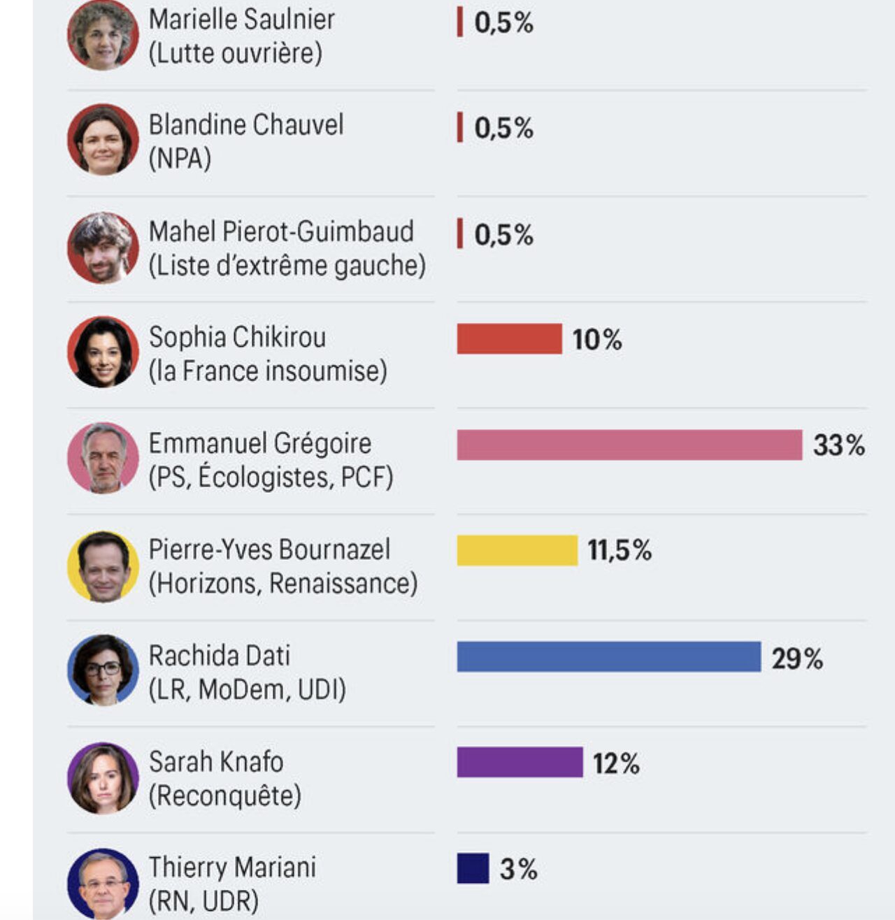 Emmanuel Grégoire (liste unie de gauche, excluant LFI, Parti socialiste et alliés) arrive en tête des intentions de vote au premier tour avec 33 %.